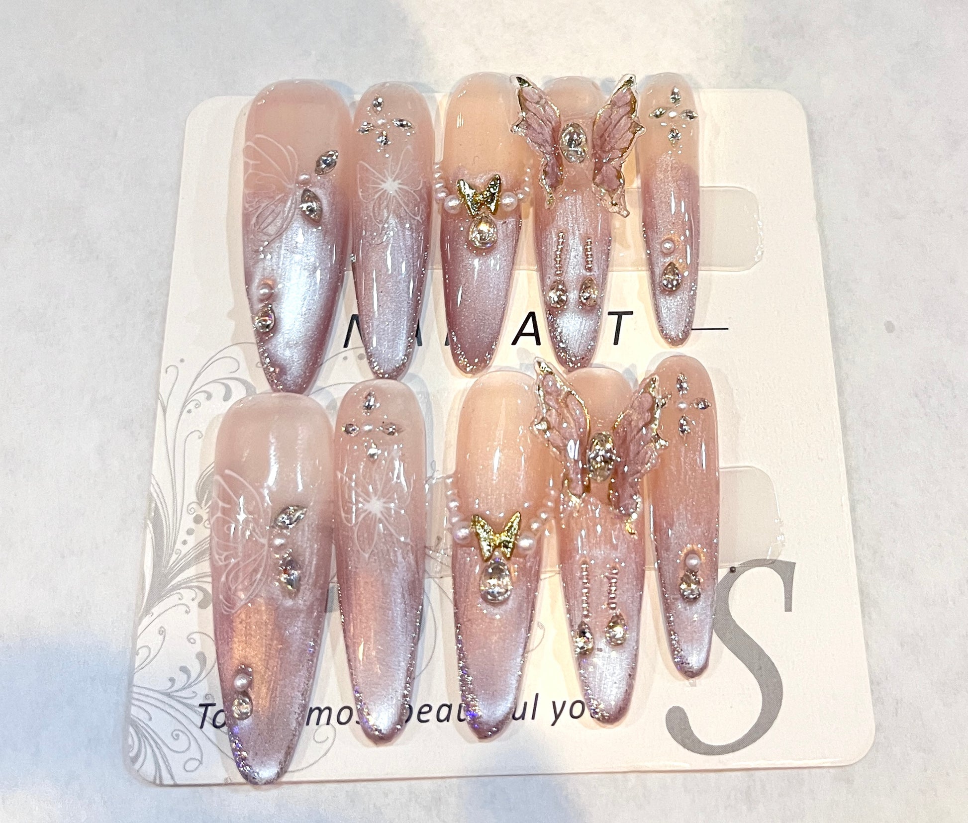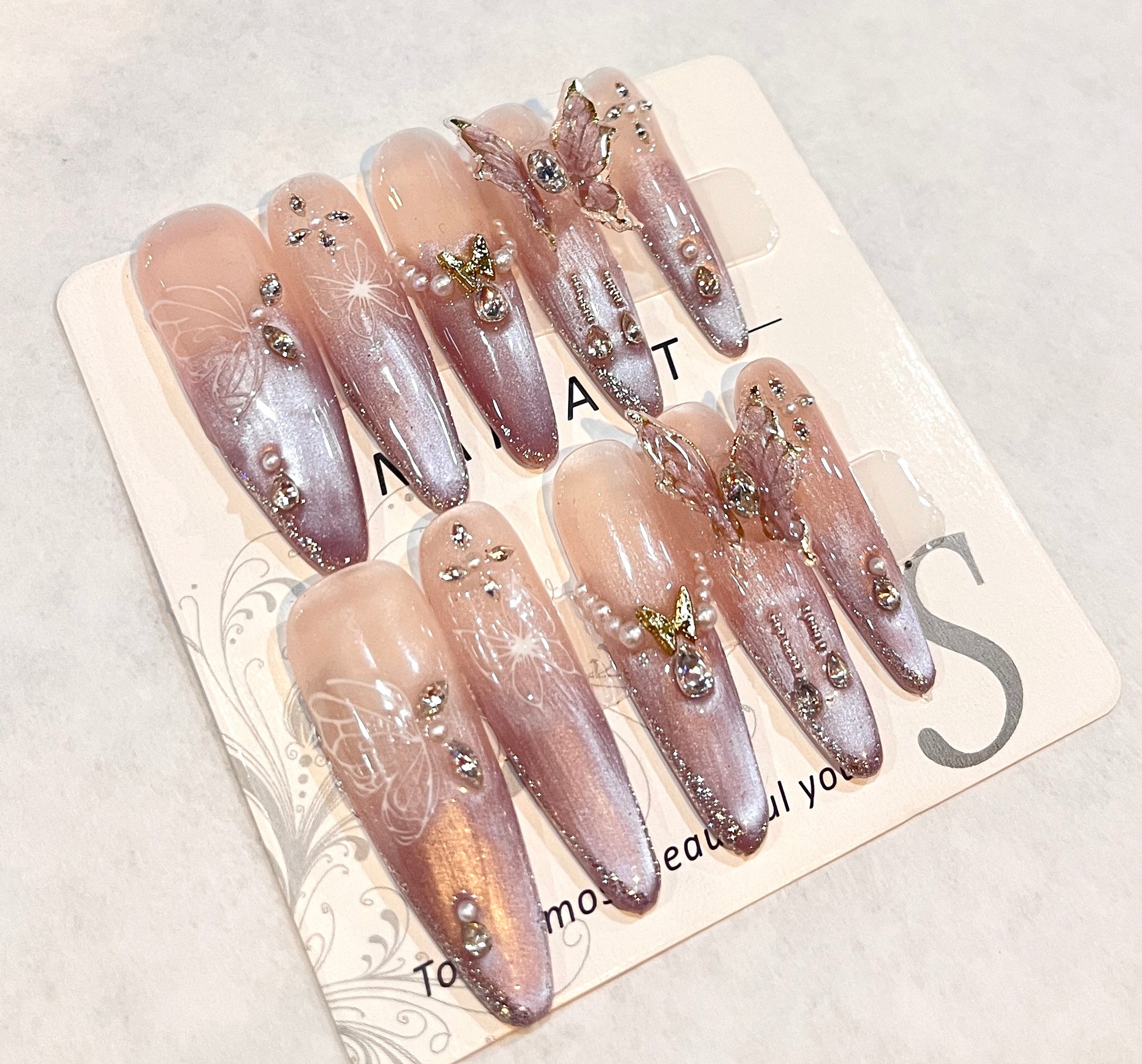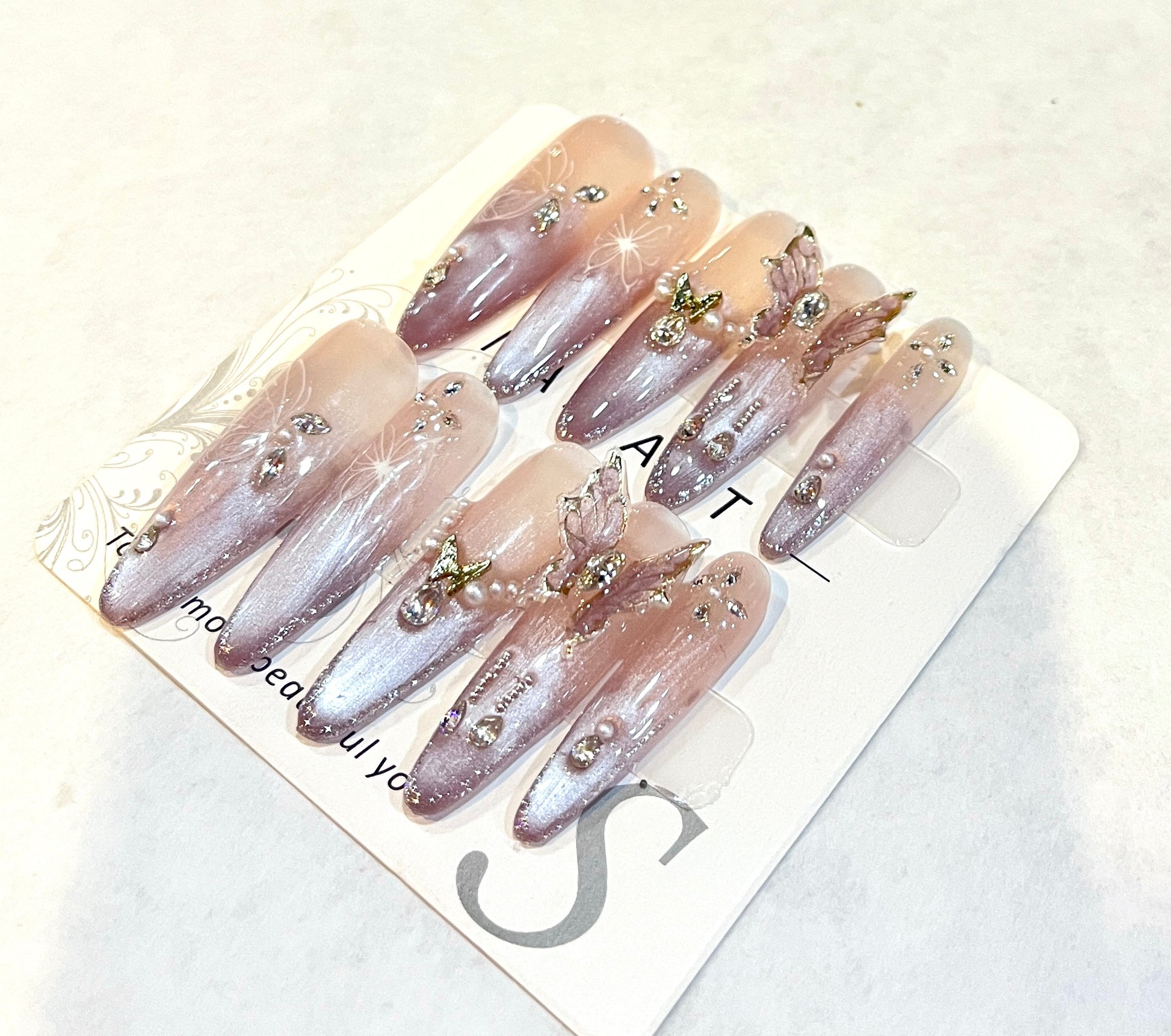 Step into a fairytale with our Blushing Enchantment press-on nails. Featuring a romantic pink-to-lavender ombre, dainty 3D butterflies, and shimmering rhinestones, this set is perfect for magical moments, bridal glam, or soft, ethereal looks.