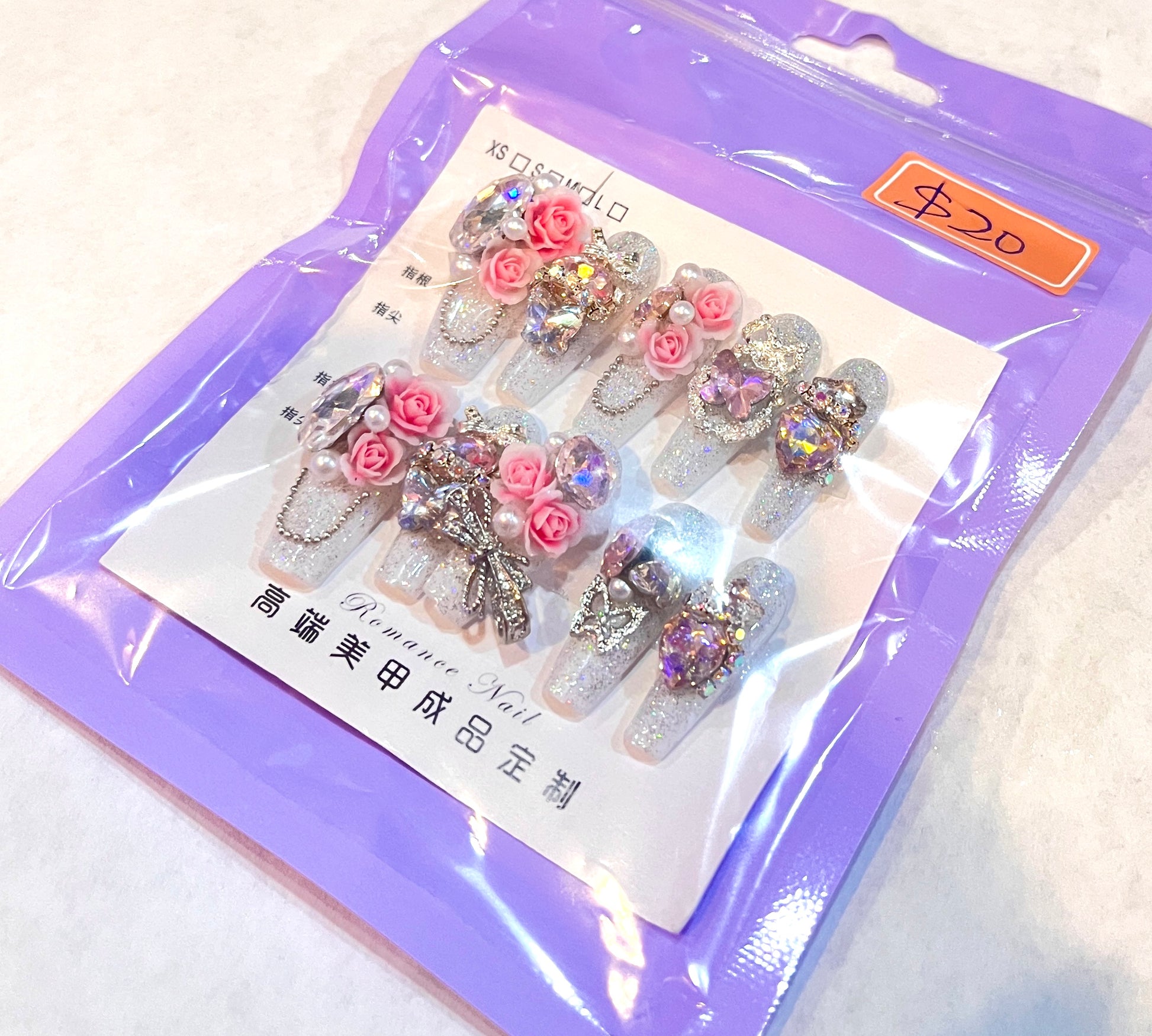 Make an unforgettable entrance with our Crystal Garden Party press-on nails. These dazzling nails feature a shimmering base with 3D pink roses, oversized rhinestones, pearls, and a touch of gold charm for a statement floral fantasy look.