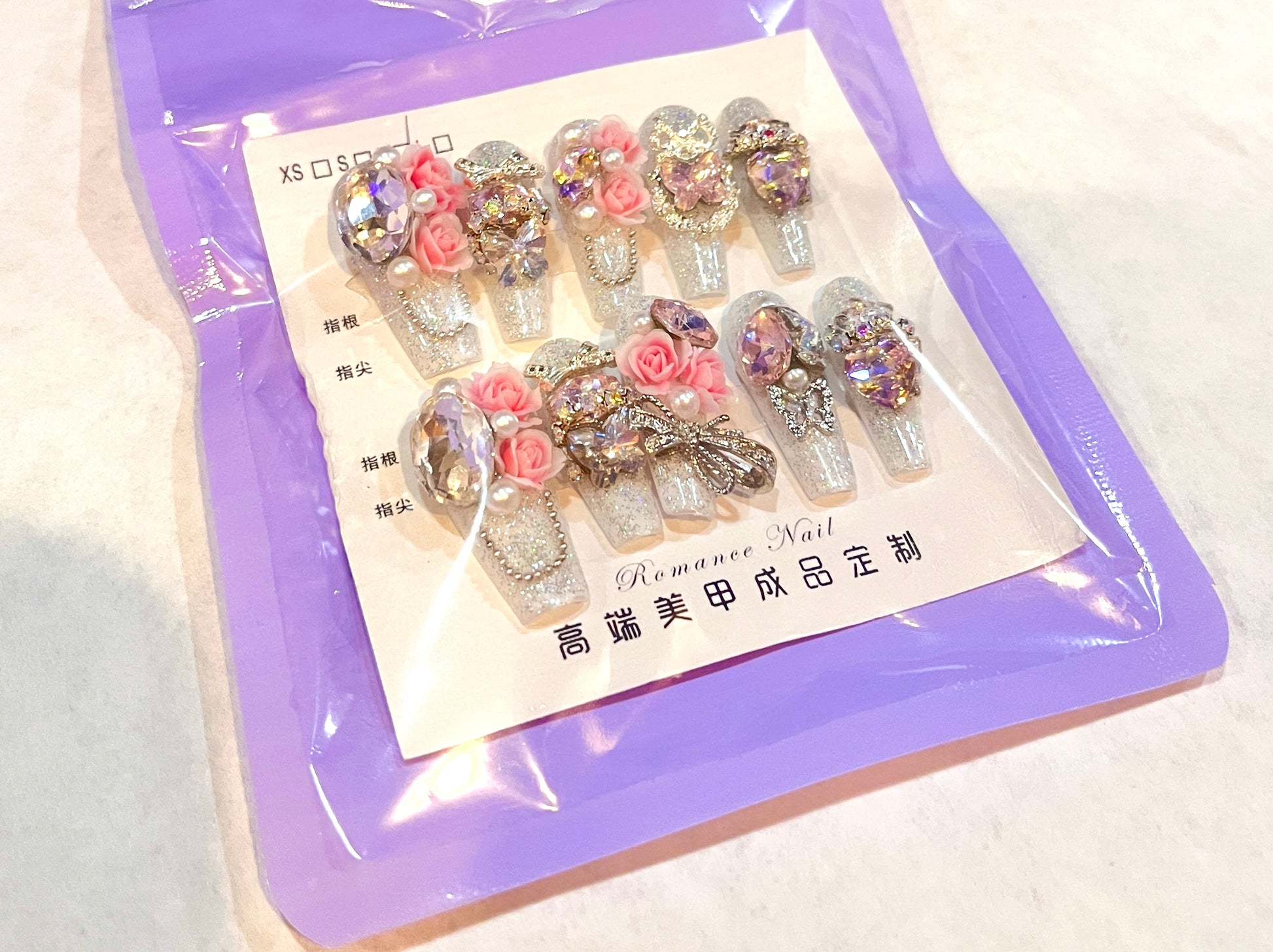 “Crystal Garden Party” Glitter Floral Press-On Nails
