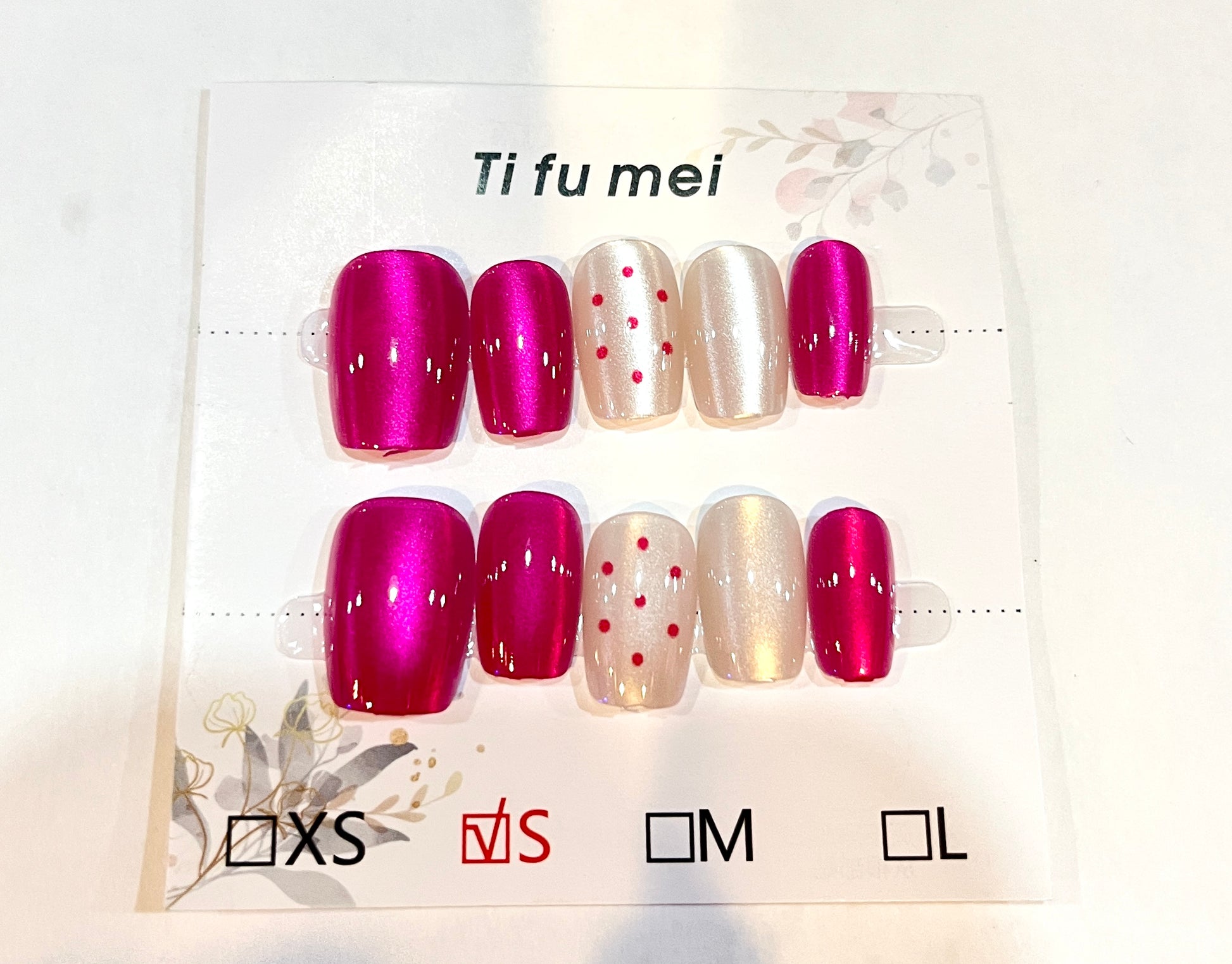 Make a bold yet sweet statement with our Hot Pink & Pearl Dot Press-On Nails, now in a stylish short tapered square shape. This 10-piece set combines mirror-shine hot pink, soft pearly shimmer, and cheerful red polka dots—perfect for casual glam, dates, or everyday fun.