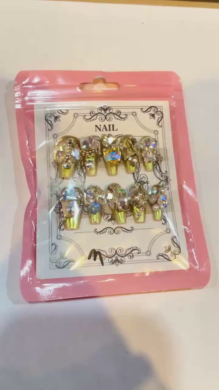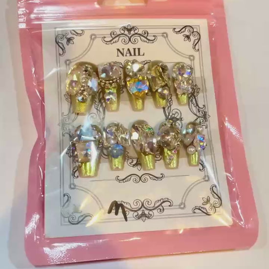 This set is for the bold. Golden glitter meets crystal drama in these statement press-ons—your nails will walk into the room before you do.