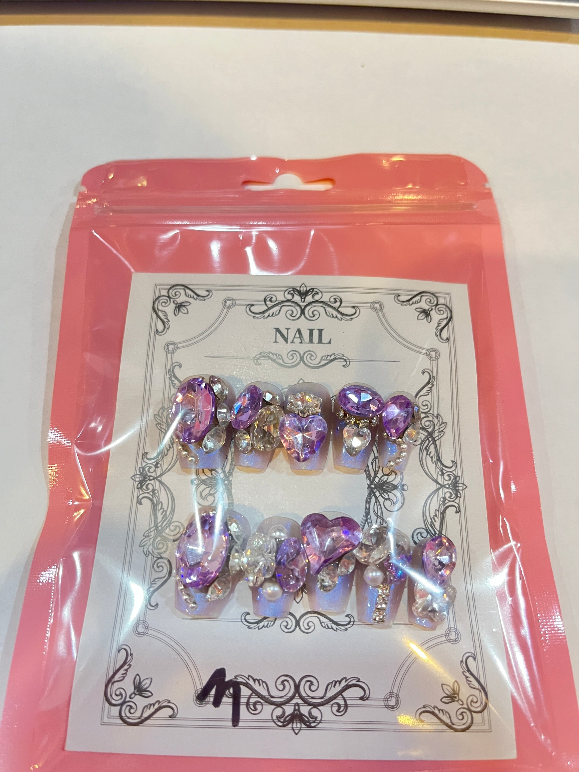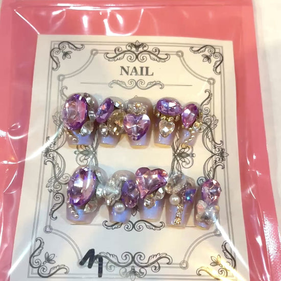 A dreamy lilac nail set for the bride-to-be. Featuring heart-cut rhinestones, pearls, and dazzling shine, it’s made to complete your unforgettable day.Go viral with these bold lilac press-ons, packed with oversized gems, sparkles, and heart charms. Made for TikTok baddies who love to slay.