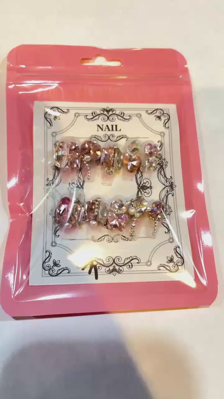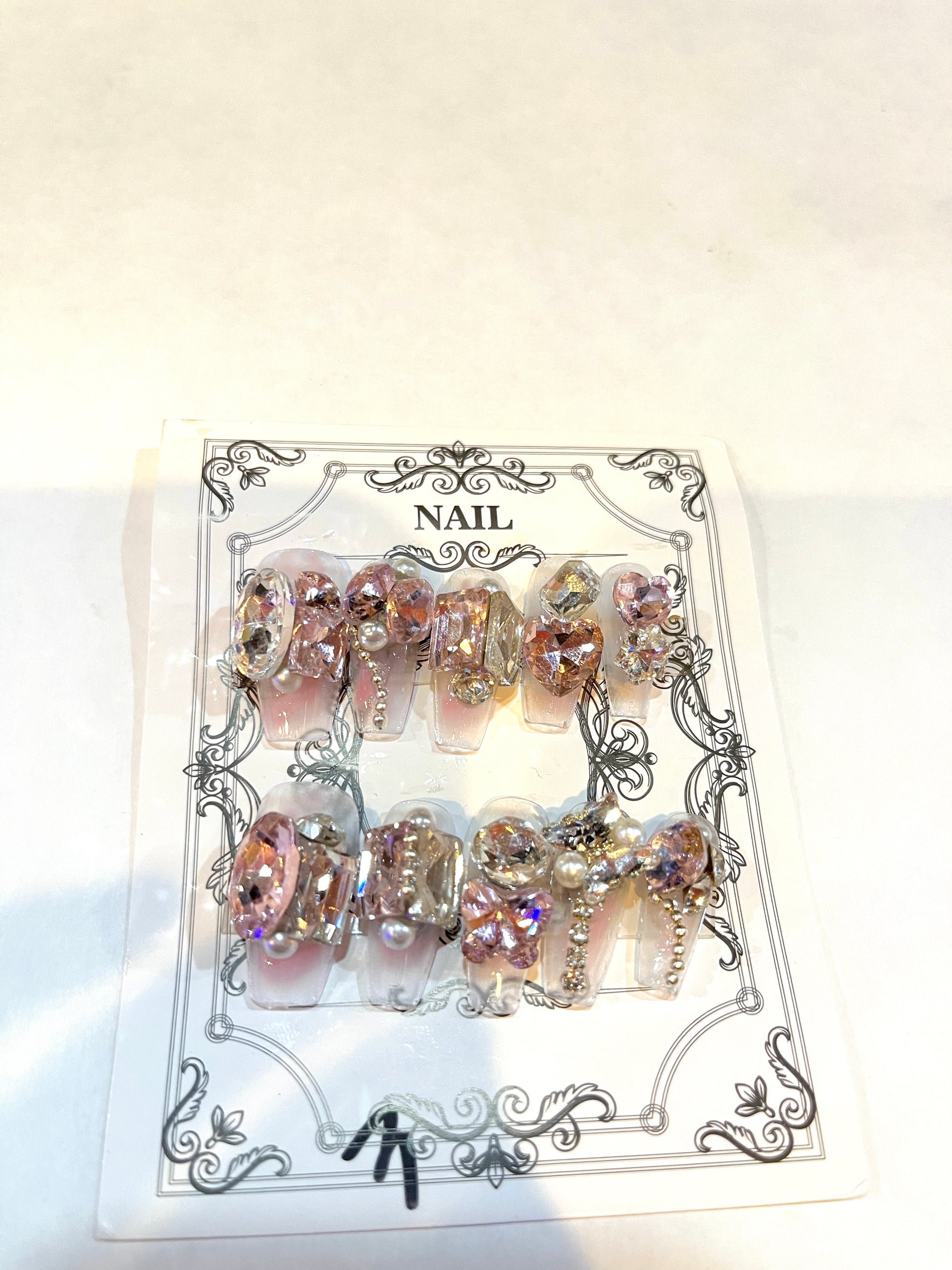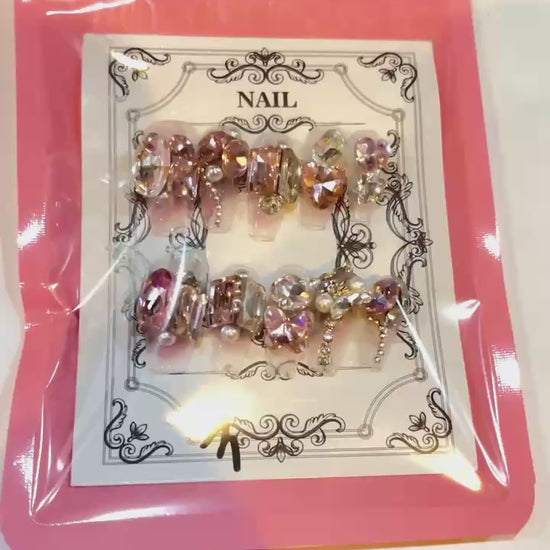 Elevate your manicure with this luxurious press-on nail set featuring a nude-pink base adorned with 3D pink gemstones, lustrous pearls, and chic chain accents. This glamorous yet edgy design captures a trending “coquette” nail aesthetic – pastel pink tones paired with pearls and other adornments.