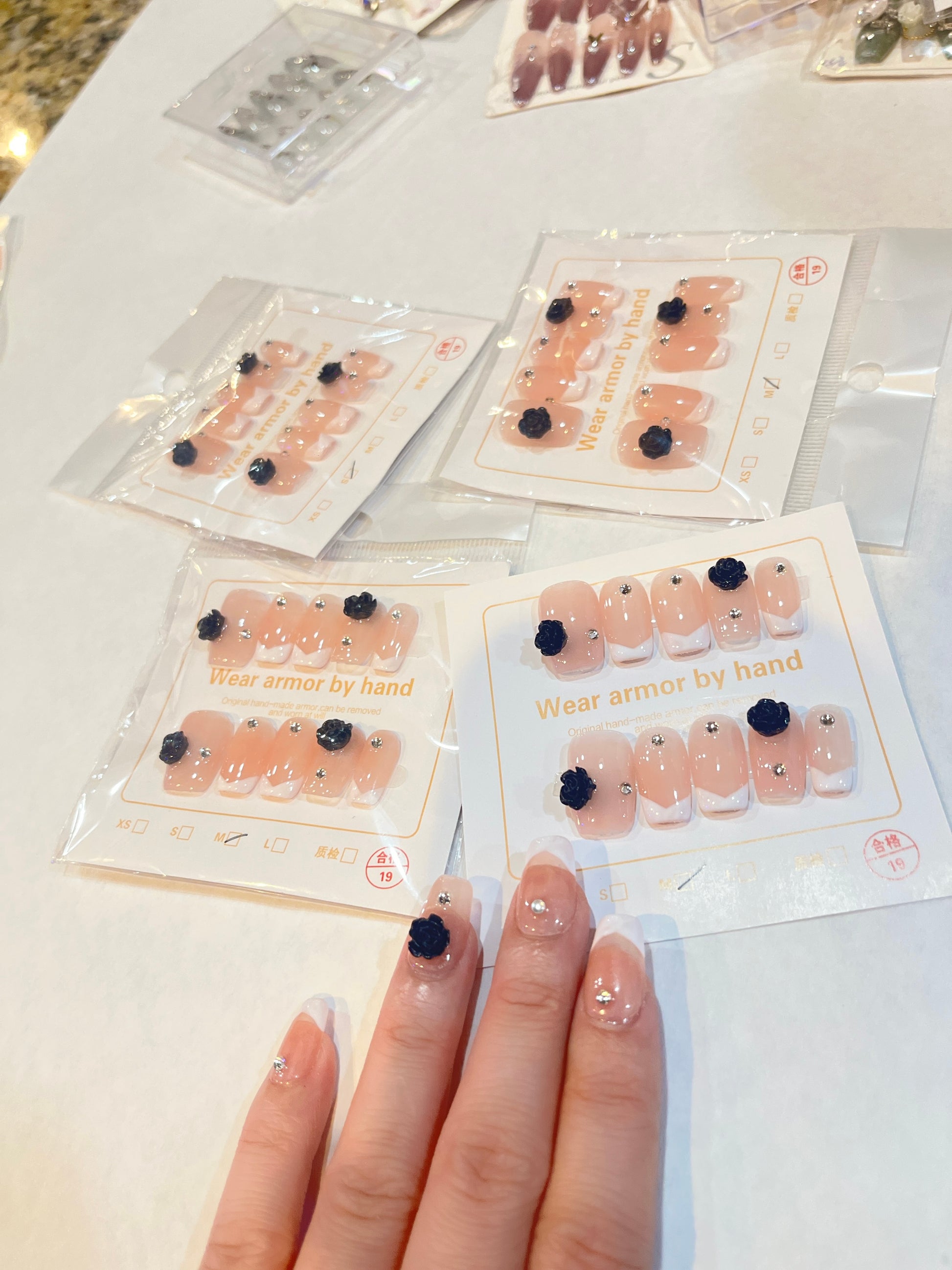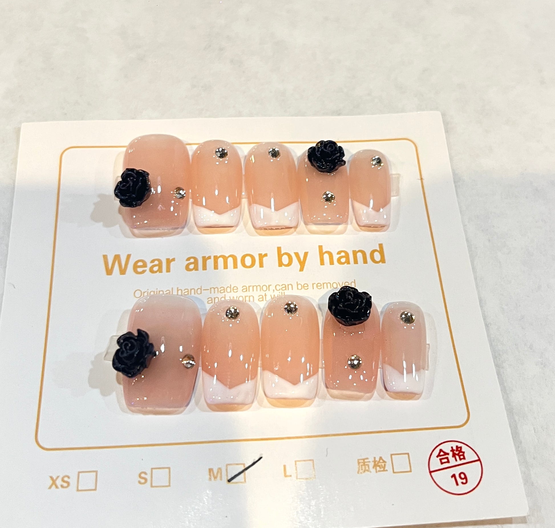 Bring drama and elegance to your fingertips with our Black Rose French Tip Press-On Nails. This medium-sized 10-piece set features a soft nude base with clean white French tips, detailed with 3D black rose accents and mini rhinestones for added sparkle. Perfect for romantic nights, formal events, or photoshoots.