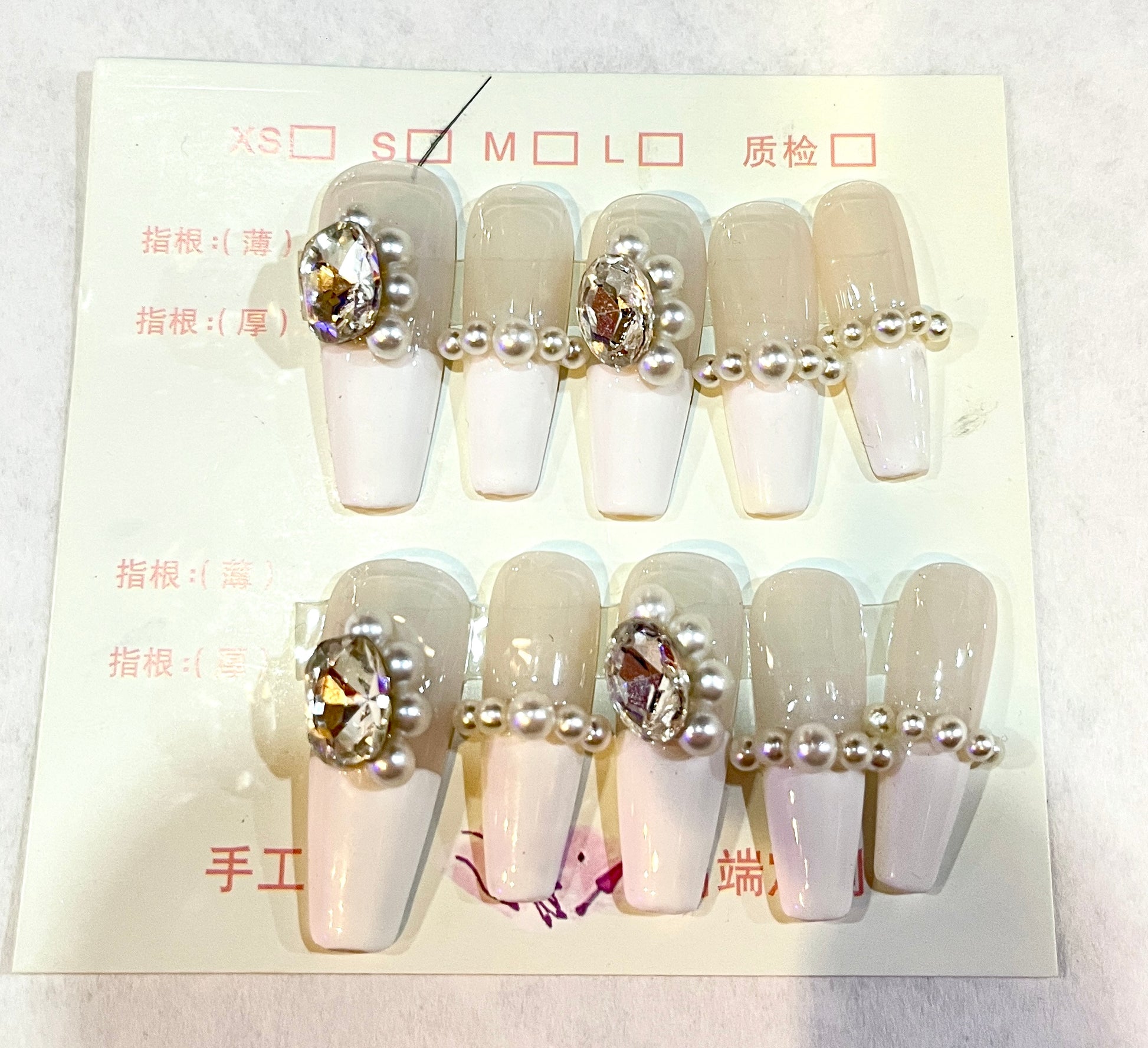 Simple yet stunning, our Pearl Elegance press-on nails are a modern twist on the classic French tip. Featuring a crisp white base with nude tops, dainty pearl accents, and a sparkling crystal gem centerpiece, this set is perfect for weddings, bridal showers, or everyday luxury.