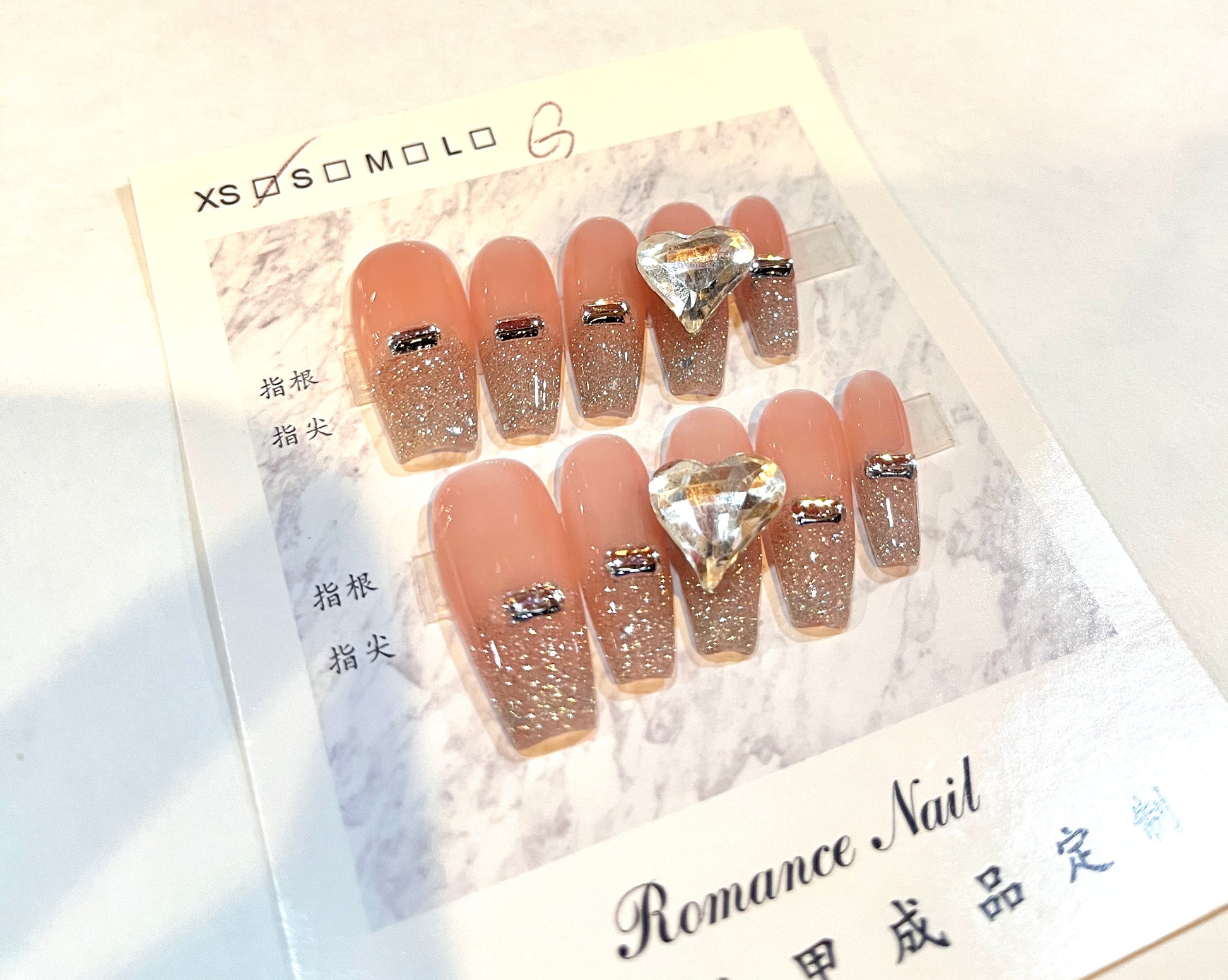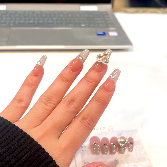 Add a touch of romance to your fingertips with this XS-sized press-on nail set. Featuring a soft pink-to-silver glitter gradient, rectangular rhinestones, and a bold heart-shaped diamond accent, this set radiates luxury and charm. Ideal for weddings, date nights, or as a dazzling gift for someone special.