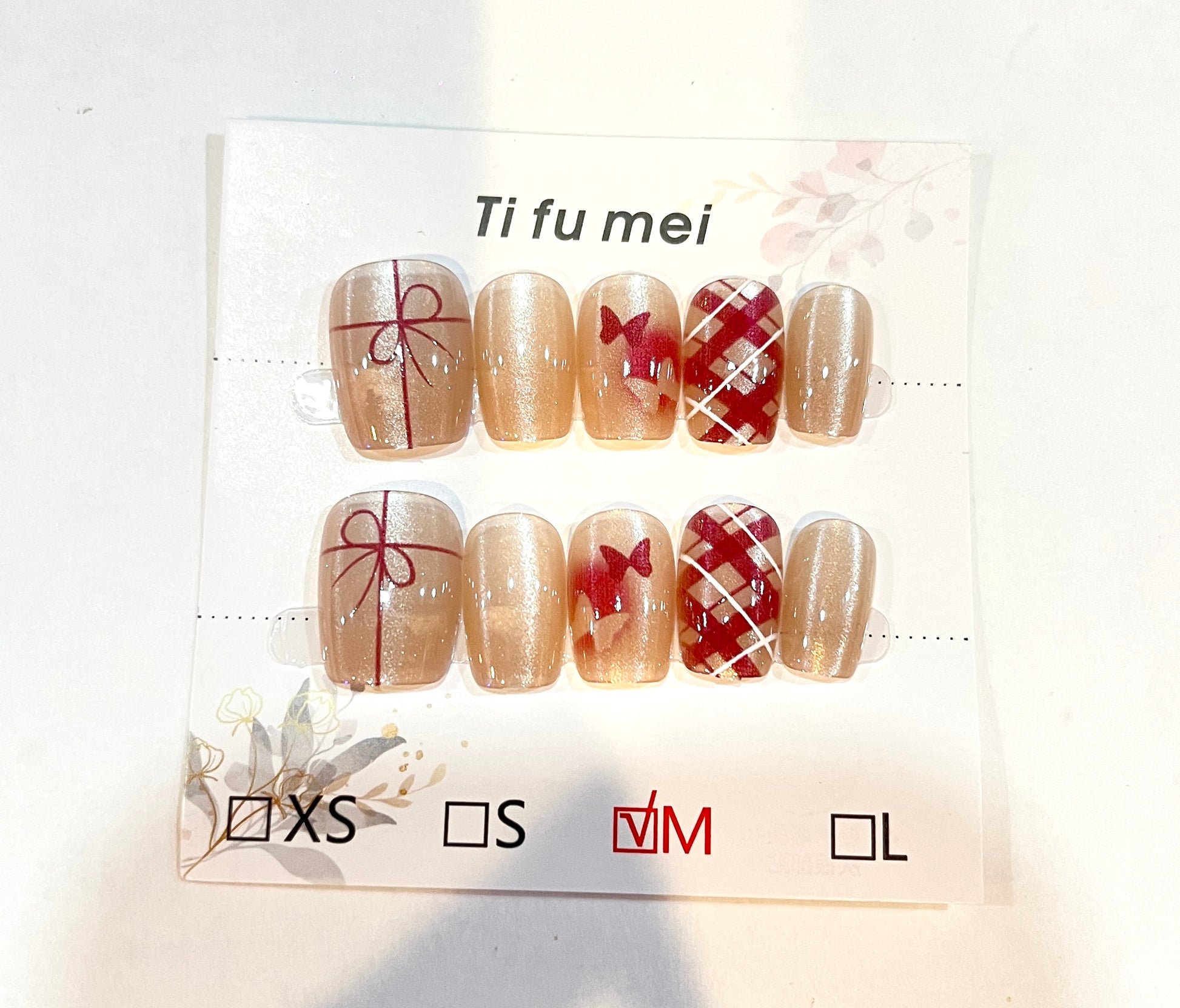 Red Plaid & Bow Gift Wrap Press-On Nails – Medium Size