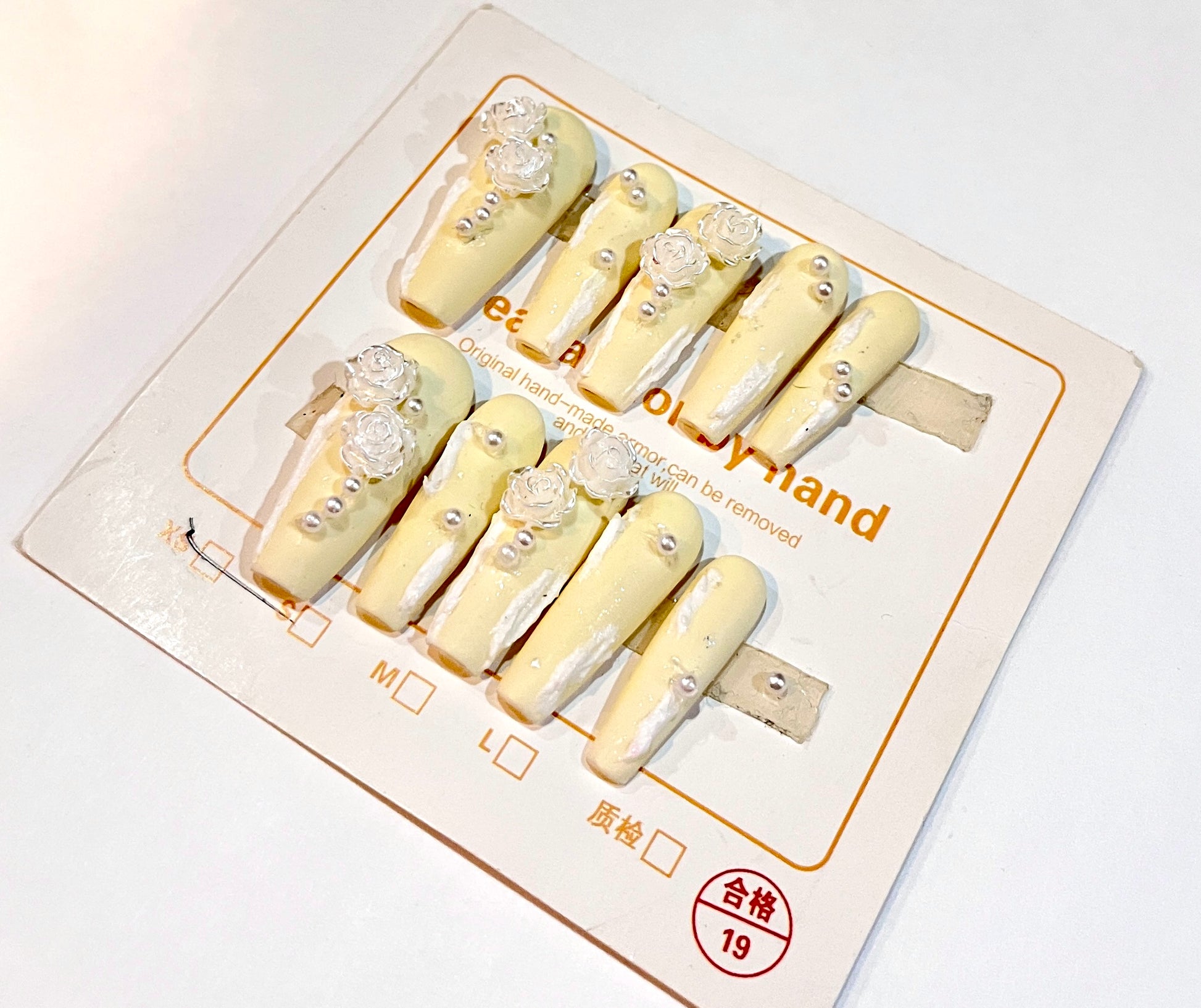 XS Size – Bridal Cream Press-On Nails | Long Coffin Style with 3D Roses & Pearl Accents